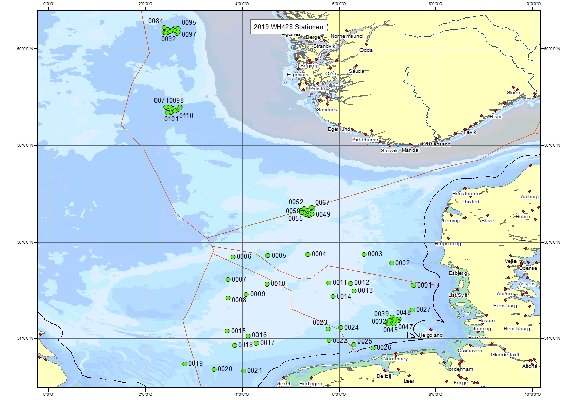 Survey WH 428 covered fisheries research representing the German contribution to the International Bottom Trawl Survey (IBTS) in quarter 3, as well as one component of the two-ship operation in the German Small-scale Bottom Trawl Survey (GSBTS). Both surveys use the same principle fishing methods but at different spatial scales, applying a GOV otter board trawl. A large subset of the fishing hauls is accompanied by hydrographic measurements and investigations of benthic epifauna, infauna and sediments. Bycatch of marine litter in the GOV is reported. The GSBTS is a national program to monitor small-scale variability as well as long term changes in demersal fish assemblages in relation to physical and biological habitat characteristics. In order to fully cover the international IBTS programme, the GSBTS component of the survey (boxes B and D) had to be reduced due to time constraints. The survey started on 08 July 2019 in Bremerhaven, starting with the IBTS on 09 July. Due to technical problems, "Walther Herwig III" returned to Bremerhaven on 20 July. After resolving these problems, the survey continued on 23 July and the remaining program was successfully completed on 02 August. The "Walther Herwig III" returned to Bremerhaven on 03 August 2019.