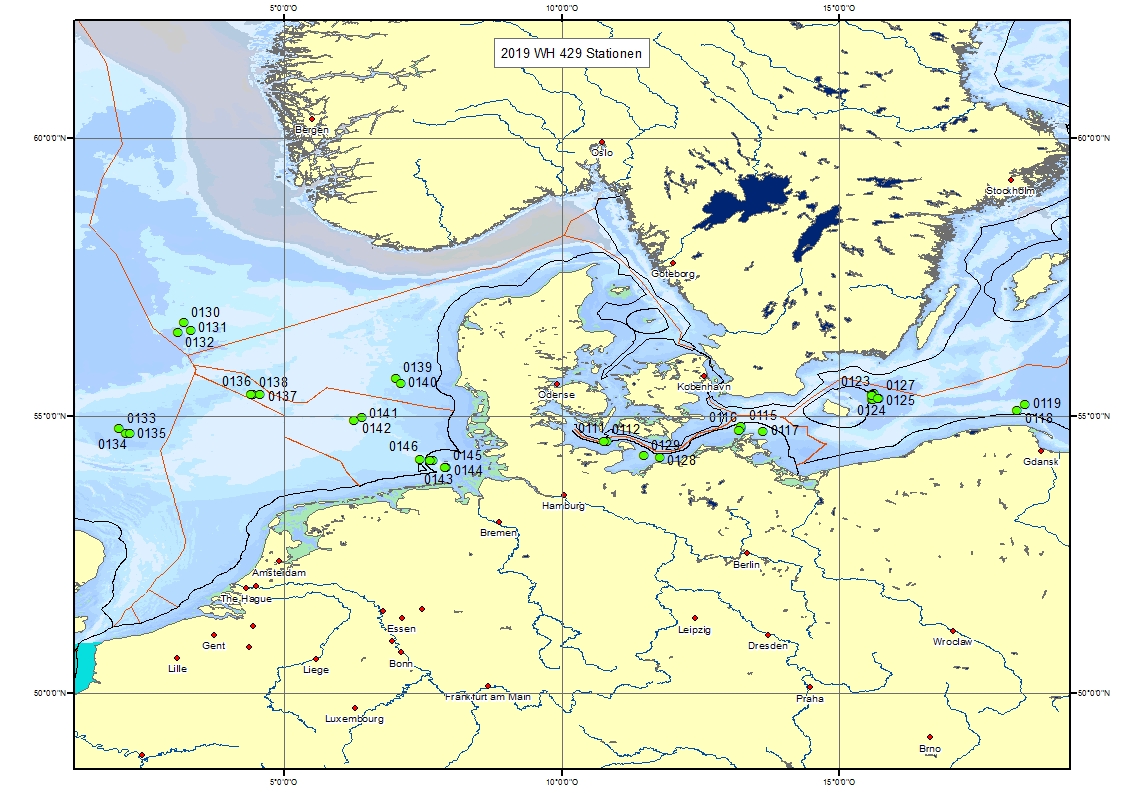 WH429: Objectives of the Cruise 1. Studies on biological effects of contaminants; 2. Studies on the occurrence of fish diseases and parasites; 3. Sampling of fish for chemical analysis of contaminants; 4. Sampling of fish and water for measurement of radioactive substances (collaboration with Univ. Hannover); 5. Tissue sampling of livers and other organs for subsequent histological and biochemical analyses (collaboration with Univ. Tartu); 6. Studies and sampling for the DAIMON2 project, including sampling of digestive tracts of cod for microbial studies (collaboration with Univ. Warszawa); 7. Hydrographical measurements (salinity, temperature, oxygen, turbidity). As part of the integrated monitoring programme of the Thunen Institute of Fisheries Ecology (FI) on contaminants and biological effects (incl. fish diseases) in fish from the North Sea and Baltic Sea, studies were carried out in five Baltic Sea and seven North Sea areas. In addition to the onboard examination of dab (Limanda limanda), flounder (Platichtys flesus) and cod (Gadus morhua) for macroscopic externally and internally visible diseases and parasites, a large range of fish samples were taken for a subsequent analysis of contaminants (organic, inorganic and radioactive substances) and their biological effects. As part of the DAIMON2 project, extensive studies were carried out on the health status of cod in a dumping area for chemical munitions in Bornholm Basin and in Baltic Sea reference areas. Furthermore, hydrographical measurements were carried out (water temperature, salinity, oxygen content) and water samples were taken for measurement of radioactive substances.
