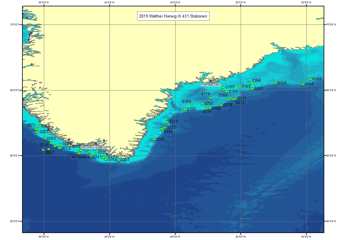 WH431: The German survey off Greenland is conducted since 1981, aiming at monitoring groundfish stocks in particular of cod and redfish, collecting environmental data and conducting ecosystem studies in the area.