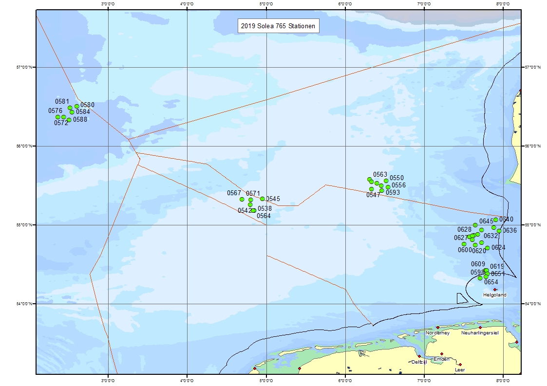 Solea 765: 1. Participation in the German Small-Scale Bottom Trawl Survey (GSBTS) to monitor the fish fauna in 6 out of 12 small areas (boxes), 2. Investigation of the hydrographical conditions within the boxes (vertical distribution of temperature, salinity and turbidity). 3. Experimental fisheries in the vicinity of two offshore windparks located in the German EEZ FFRV "Solea" left Cuxhaven on the 25nd of July 2019 and started its scientific program the following day in Box P. In general, the scientific program consisted of three days with 7 hauls per day within each box. Each day at least two CTD casts were deployed. The scheduled personnel exchange was carried out around noon of the 4th of August in Esbjerg. The scientific program continued from the 25th of July until the 9th of August. The vessel returned to Cuxhaven on the 10th of August 2019.