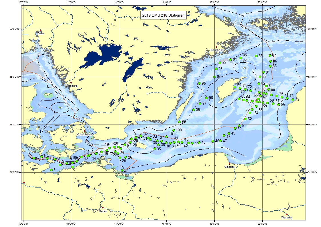 The cruise EMB-218 was carried out as a joined cruise of the environmental monitoring program of the Federal Maritime and Hydrographic Agency (BSH) and the Baltic Sea long term observation program of the Leibniz Institute for Baltic Sea Research Warnemunde (IOW). It was the fourth cruise in 2019 in a series of five expeditions performed annually. The data acquired are used for the regular national and international assessments of the state of the Baltic Sea, and provide the scientific basis for measures to be taken for the protection of the Baltic Sea ecosystem. The cruise was performed at fair weather conditions that the challenging station grid of 104 stations was successfully completed.