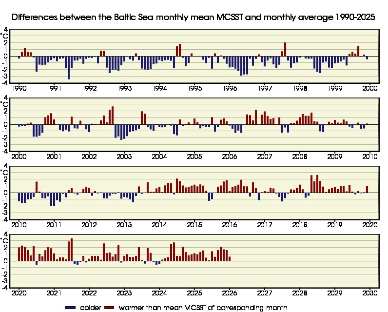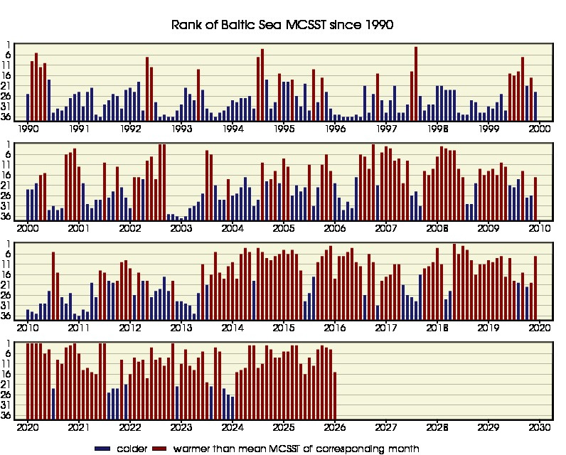 The rank of a monthly mean value is determined by its position when all mean values of the month from 1990 till today are sorted by magnitude. Rank 1 characterizes the month with highest SST since 1990. The highest rank values represent coldest temperatures. A red bar indicates a temperature warmer than the mean value of the respective month, a blue bar a colder value.